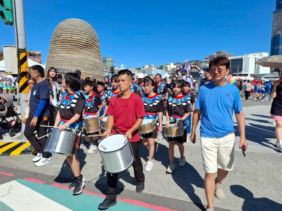 來自東信國小的森巴鼓隊再度受邀參與,以充滿熱情的節奏和整齊劃一的步伐,孩子們身著繽紛的表演服裝,隨著鼓點律動,現場氣氛瞬間被點燃。校長曾恕華多年來親自陪伴參與,為學生打氣加油;在藍楷博老師細心指導與家長們的熱情支持下,森巴鼓隊的學生以堅定的眼神與自信的笑容,傳遞出屬於基隆孩子的自信與快樂。