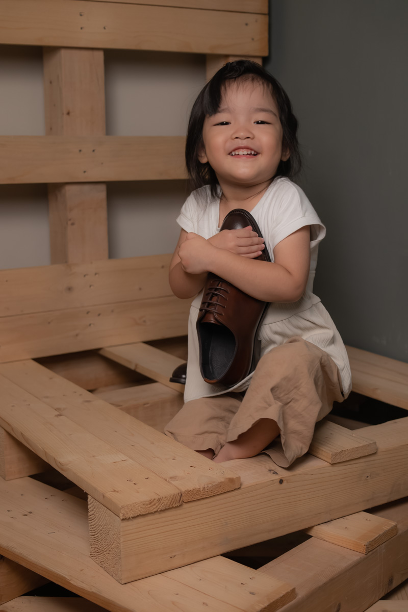 【記者宋吉清/基隆報導】基隆在地手作鞋品牌「凡人與路」近日推出新品「一片式牛津皮鞋-刷色咖(男女情侶鞋款)」,特別邀請品牌創辦人宋之凡的女兒小CC擔任代言人。照片中,小CC緊緊擁抱著心愛的皮鞋,純真的笑容成為品牌最溫暖的宣傳語:「我超愛這雙,不要跟我搶,要跟我買!」,以童心詮釋工藝,讓這雙原本屬於紳士的鞋款,多了一份生活感與親和力。