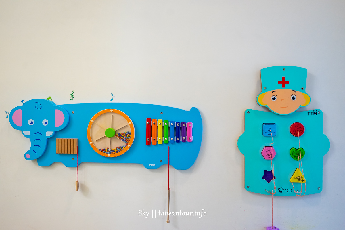 沒有人和妹妹搶,從頭到尾玩到不想睡,牆面上也有觸覺型的玩具面板,尤其是竟然還有彈珠台,這可是免費暢玩!妹妹玩到這就不想走了!